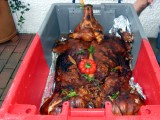 Das ofenfrische Spanferkel wird vor Ort zerlegt, tranchiert und durch den Chef serviert.